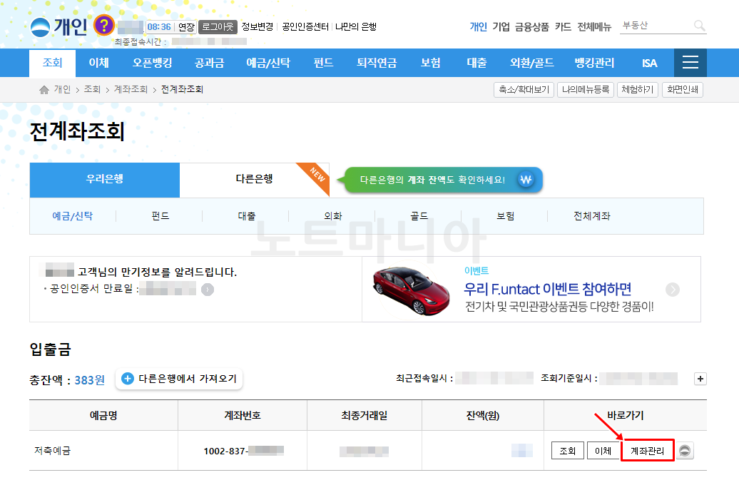 로그인하면 아래와 같이 자동으로 전 계좌조회 화면으로 이동한다. 여기에서 우리은행 통장 사본 출력을 위해서는 바로가기에 있는 계좌관리를 눌러준다.