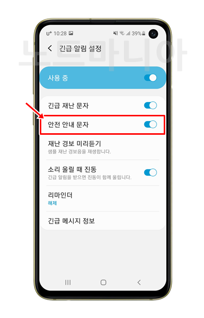 우리가 차단하려고 설정하는 항목은 안전안내문자다. 이점 헷갈리지 말고 유의해야 한다. 아래와같이 안전안내문자를 꺼준다.