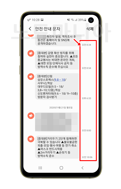 1. 갤럭시 메시지 앱으로 들어간다. 아래 캡처화면을 보면 알 수 있겠지만, 지금도 안전안내문자가 와있다. 수시로 온다. 하루에 한번 오는것도 괴로운데, 너무 많이 온다. 솔직히 중요한 내용이니까 숙지해야 하는것은 맞지만, 너무 남발하다보니 중요한 정보라는 생각이 차츰 사라져간다.
