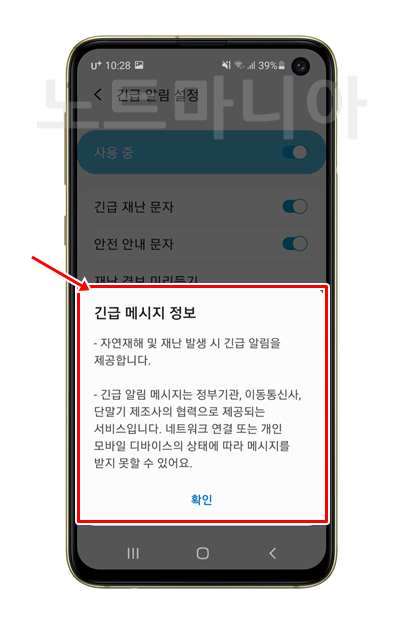 또한 긴급 알림 메시지는 정부기관이나 이동통신사, 단말기 제조사의 협력으로 제공되는 서비스로 모바일 디바이스의 상태에 따라서 메세지를 못 받을수도 있다고 안내되어 있다. 그렇다. 망 통신 상황이 안좋으면 못 받을수도 있다고 한다. 이건 좀 개선이 필요해 보인다.