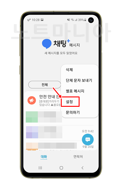 2. 메시지 앱에서 우측 상단을 보면 점 세개가 보인다. 메뉴 버튼이다. 눌러보면 설정 메뉴가 나타난다. 설정을 누른다.