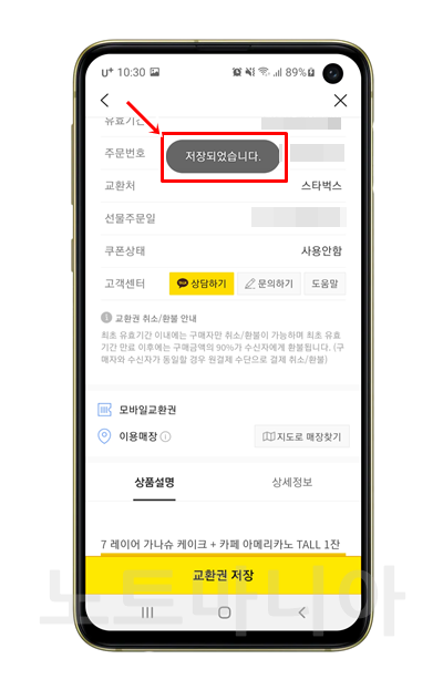 그러면 아래와같이 '저장되었습니다.'라고 토스트 메세지가 나타났다가 사라집니다. 이제 거의 다 됐습니다. 저장된 기프티콘을 보내고 싶은 사람에게 보내기만 하면 되는데요.