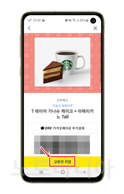 그러면 아래와같이 기프티콘 상세화면이 나옵니다. 여기에서 아래쪽에 보시면 '교환권 저장' 버튼이 있습니다. 이 버튼을 눌러주세요.