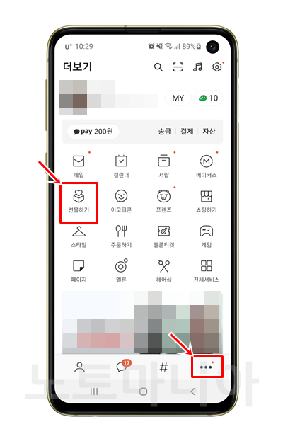 우선 카카오톡을 실행해주세요. 그다음 메뉴 버튼을 눌러주세요. 아래에 보시면 점세개가 있는 아이콘이 메뉴 아이콘입니다. 그다음에는 선물하기 아이콘을 눌러주세요.
