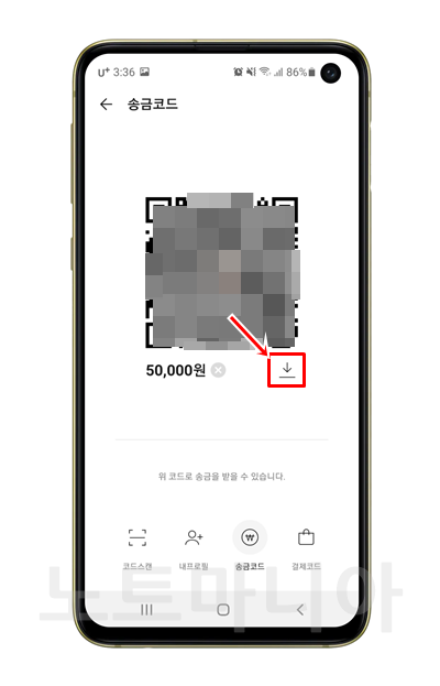 아래쪽에 보시면 송금코드 라는 아이콘이 있습니다. 이걸 누르시면 이렇게 카카오페이 송금받기를 위한 코드가 나옵니다.