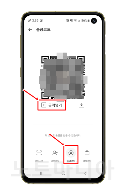 여기에서 금액넣기를 하실수도 있습니다. 정확히 얼마를 받아야 하는지 정해져있다면, 금액을 넣어서 보내거나 블로그, 홈페이지, 상품 판매 페이지에 게시하면, 상대방은 금액을 입력할 필요도 없이 QR스캔만하면 자동으로 금액이 입력됩니다. 한번 해볼게요. 금액넣기를 눌러주세요.
