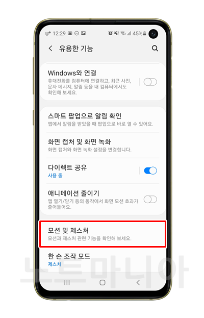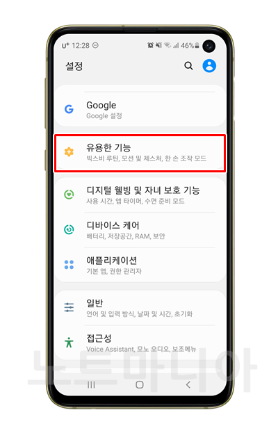 만약 손날로 밀어도 갤럭시 스크린샷이 잘 안되면, 설정이 꺼져있어서 그런 것이다. 아래와 같이 설정으로 들어가서 유용한 기능 > 모션 및 제스처로 들어간다.