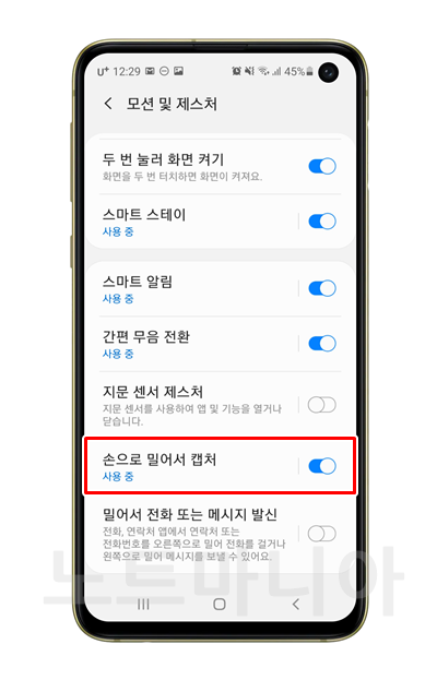 그다음, 손으로 밀어서 캡처를 ON 시켜주면 화면 손으로 밀어서 캡처하는 기능이 동작한다.
