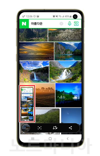 스크롤 캡쳐 하는 법은 위에서 설명한 두 가지 방법 중 아무 방법으로나 스크린샷을 한 다음 아래와 같은 메뉴가 나타날 때, 아래로 된 화살표를 누르면 아래쪽으로 스크롤캡쳐가 된다.