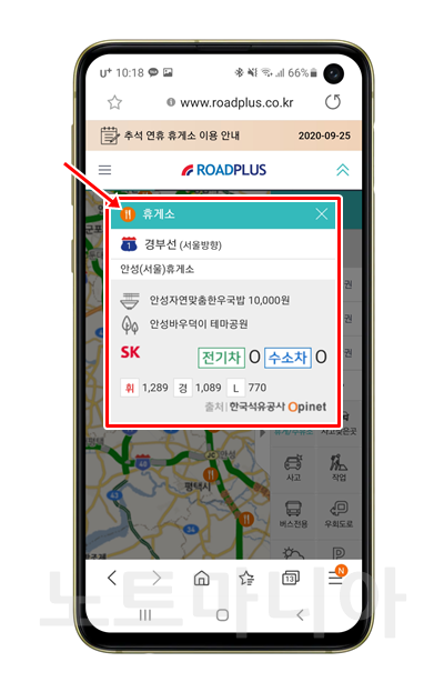 이제부터 로드 플러스의 강력한 기능들을 소개하겠다. 우측 메뉴에서 휴게/주유소 버튼을 누르면 지도상에 고속도로의 휴게소가 모두 나타난다. 그리고 휴게소 아이콘을 누르면 그 휴게소의 정보가 간략하게 요약되어 나타난다. 경부고속도로의 안성휴게소는 한우국밥이 맛잇는데 정확하다.