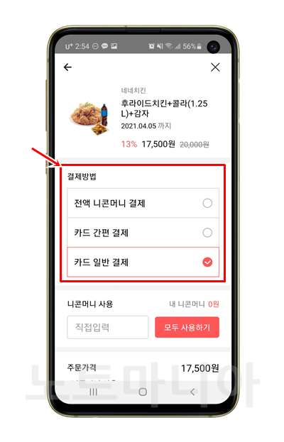 마지막 카드 일반 결제는 다른 쇼핑몰처럼 카드 결제화면으로 넘어갑니다. 저는 삼성페이를 주로 쓰기 때문에 카드 일반 결제를 선택했습니다. 다양한 페이 결제를 하시려면 '카드 일반 결제'를 선택해주세요.