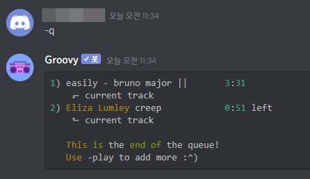 지금까지 디스코드 그루비 사용방법과 명령어 모음을 알아보았다. 명령어 사용이 처음에는 조금 어려워 보이지만 막상 사용해보면 별로 어렵지 않다. 끝.