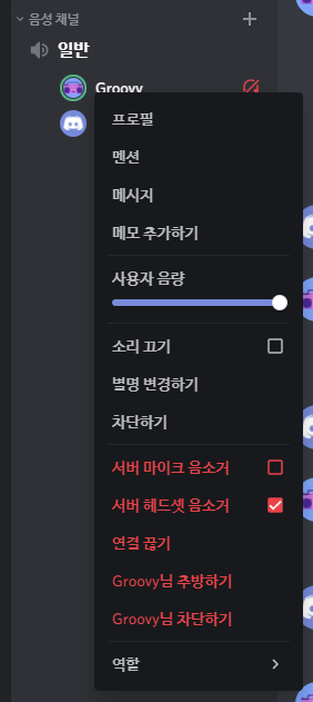 음량 조절을 하고 싶으면 아래와같이 그루비를 마우스 우클릭하고 음량을 조절할 수 있다.