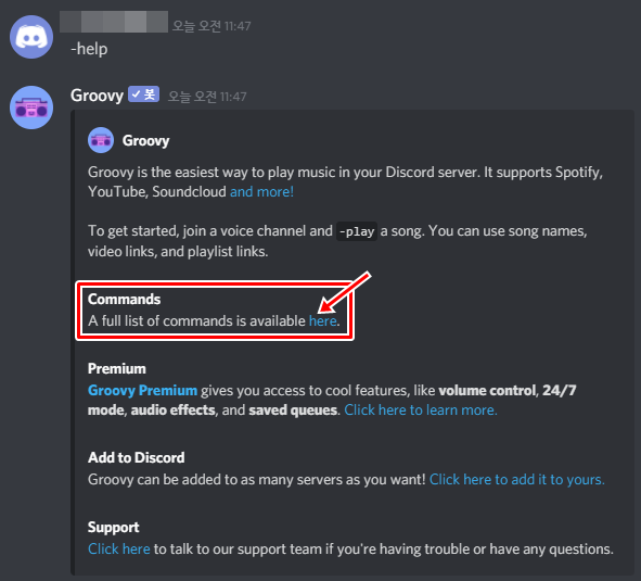 위 목록은 일반 명령어 목록이다. 프리미엄에서만 사용할 수 있는 기능은 모두 제외했다. 디스코드 그루비 명령어는 -help를 입력하고 Commands 페이지를 통해서 확인할 수 있다.
