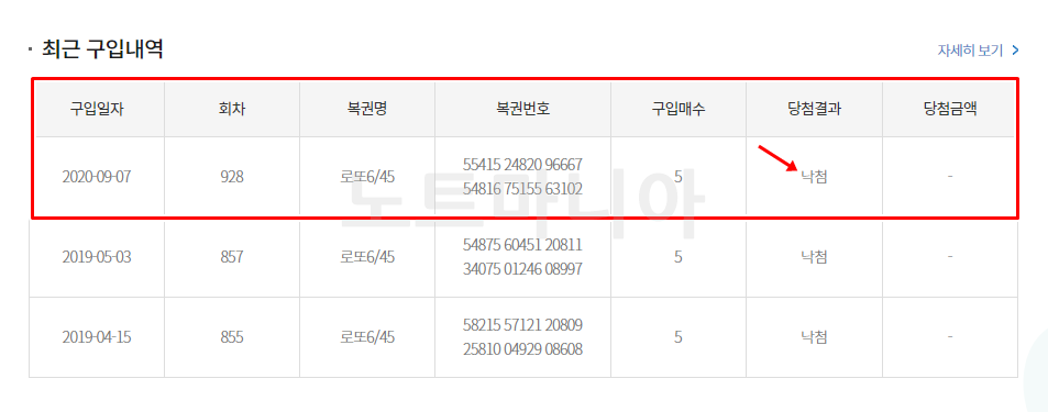우측 상단의 메뉴를 이용해서 로그인을 한다. 그리고 마이페이지를 눌러서 들어가면 아래와같이 자동으로 당첨결과를 보여준다.