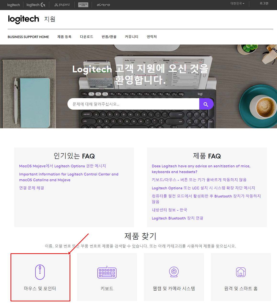 로지텍 지원 홈페이지로 들어왔으면, 자신이 다운로드 받고 싶은 제품을 선택한다. 나는 마우스를 기준으로 설명하려고 한다.