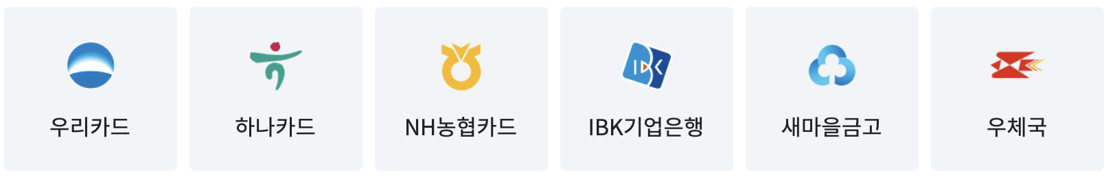 - 하나BC카드, IBK기업은행, 새마을금고중앙회, 우정사업본부(우체국)