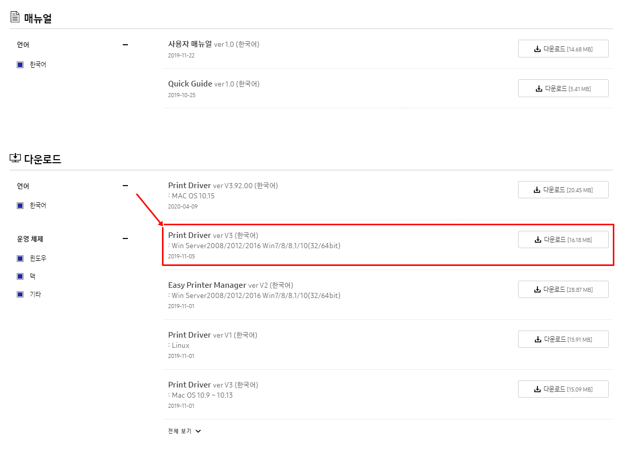 MAC과 Windows, Linux등 운영체제별로 프린터 드라이버를 제공하고 있다. 대부분은 윈도우 운영체제를 사용한다. 윈도우 운영체제의 경우 아래의 화면과 같은 삼성프린터 드라이버 다운로드 버튼을 눌러 다운로드를 하면 된다.