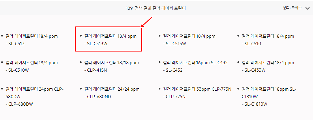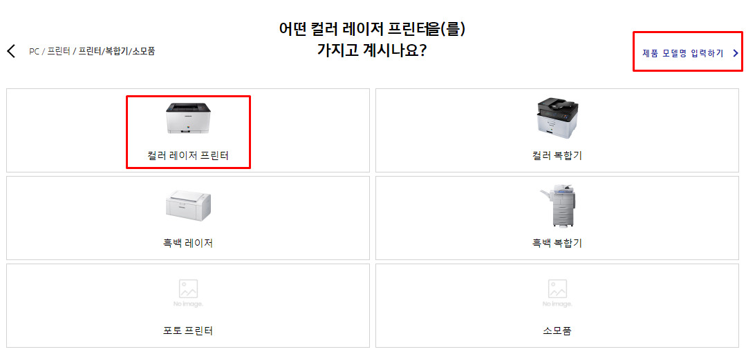 그러면 이런 화면이 나타난다. 여기에서 자신의 모델을 바로 입력하면 다이렉트로 드라이버 다운로드를 받을 수 있다. 또한 자신이 설치하고자 하는 프린터가 컬러 레이저 프린터라면 모델을 눌러서 들어가도 된다.