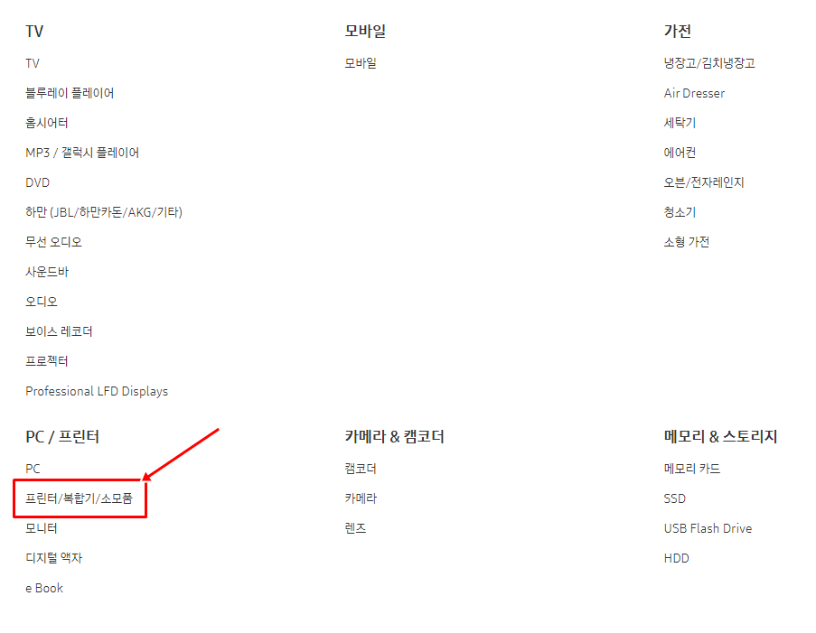 다음과 같은 홈페이지가 나타난다. 하지만 프린터는 보이지 않는다. 제품 더 보기를 누르고 아래에 나타나는 메뉴에서 프린터/복합기/소모품을 선택한다.