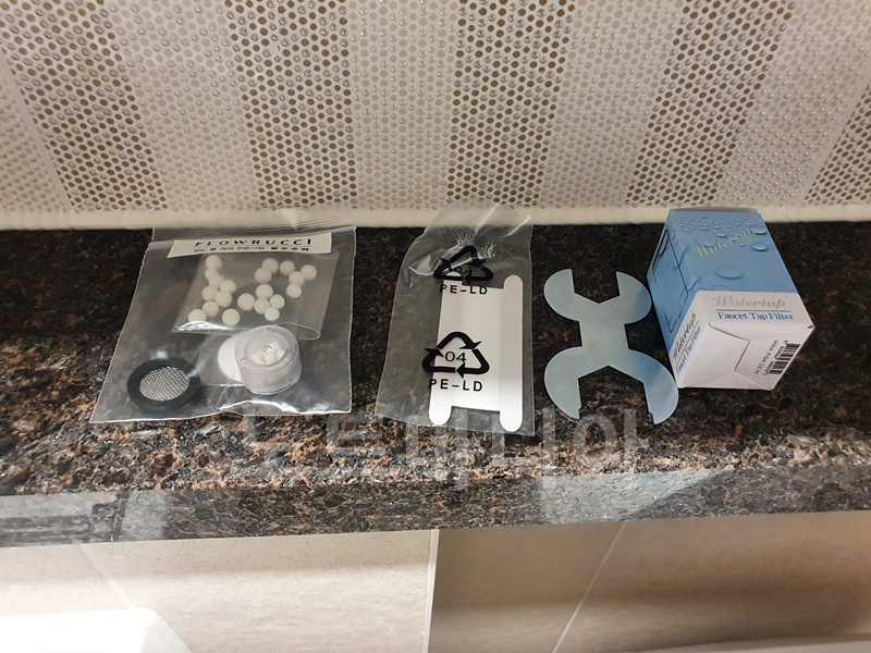 세면대 필터 플로루찌 워터탭의 구성품은 이렇게 되어있다. 필터 5종 세트, 실링 테이프와 미니 렌치, 플로루찌 워터탭 바디가 들었다. 렌치가 있어야 기존 수도꼭지의 탭을 돌려서 분리 할 수 있다.