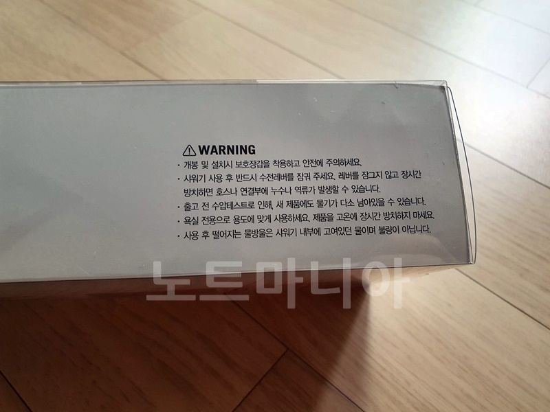 주의사항에보면 '샤워기 사용 후 반드시 수전레버를 잠궈 주세요.' 라는 문구가 있다. '수전 레버를 안 잠그는 사람도 있나?' 라고 생각하기 쉬지만, 샤워기 넥 부분에 물이 잠시 안나오도록 잠궈주는 부분이 있어서 그 부분만 잠그는 사람이 있어서 그런 것이다.