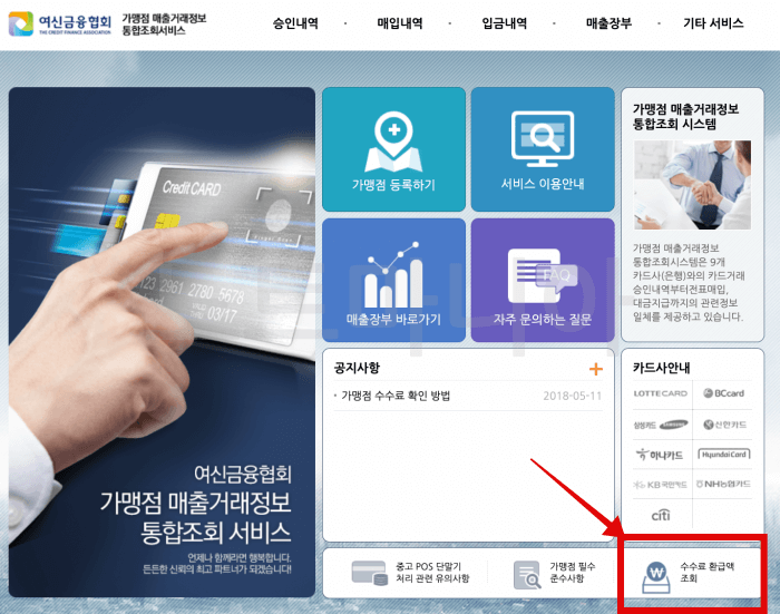 1. 여신금융협회 가맹점 매출거래정보 통합조회 서비스 홈페이지로 이동합니다. 그리고 아래와 같이 우측 하단에 있는 [수수료 환급액 조회] 메뉴를 선택합니다.