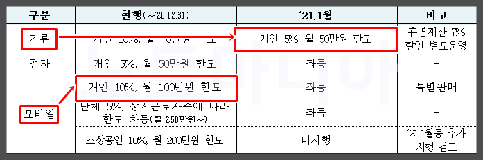 2021년에도 지류와 전자 상품권의 경우에는 월 50만원 한도에 5% 할인, 모바일 상품권의 경우에는 월 100만원 한도에 10% 할인을 유지한다고 발표했습니다.