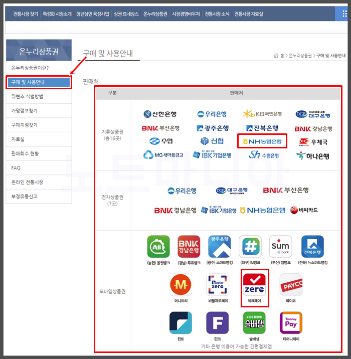 홈페이지로 이동한 다음, 온누리상품권 - 구매 및 사용안내로 들어오시면 판매처가 나옵니다. 신한은행, 우리은행, KB국민은행, 수협, 신협, NH농협은행, 우체국, 새마을금고, IBK기업은행, SH수협은행, 하나은행입니다.