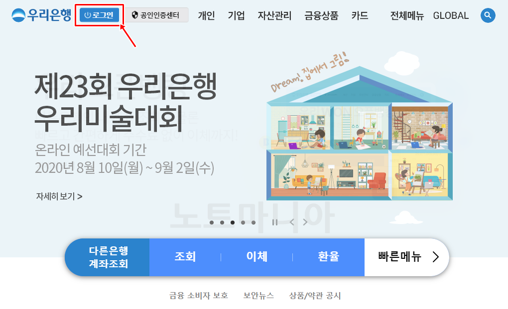 아래와같이 우리은행 홈페이지가 나타나면 로그인을 해준다. 공인인증서로 로그인을 하면 된다. 만약 타행 공인인증서일 경우, 간단하게 주민등록 번호와 OTP 번호를 입력하면 타행 공인인증서도 등록이 가능하다.