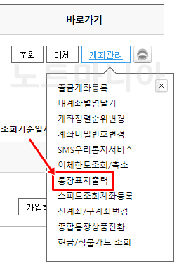 그러면 이렇게 추가 메뉴가 나타나는데, 통장 표지 출력을 눌러야 통장사본 출력이 가능하다.