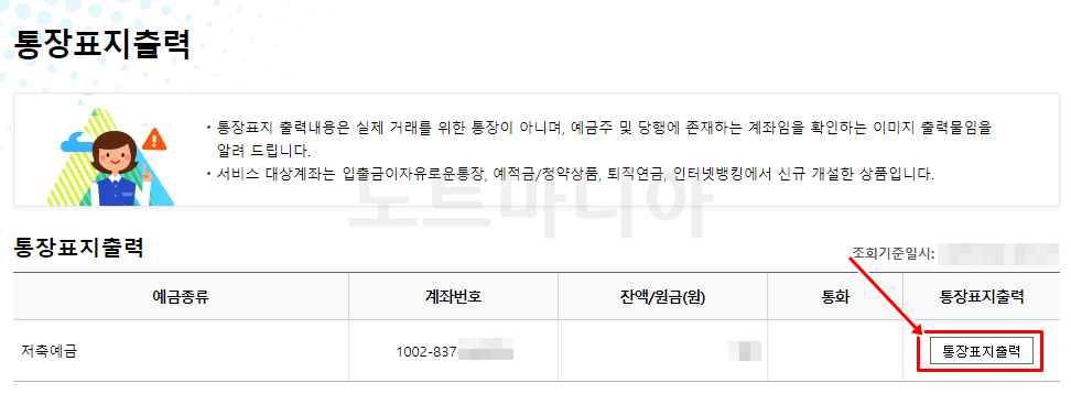 다음과 같은 통장표지출력통장 표지 출력 화면이 나오면 출력하고자 하는 계좌의 통장 표지 출력을 누른다.
