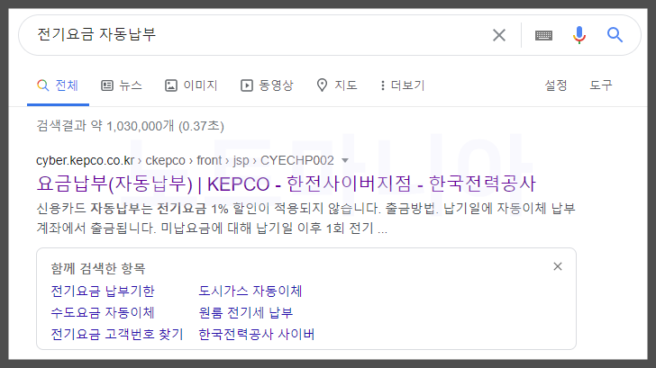 네이버나 구글 등 포털에서 '전기요금 자동납부'라고 검색을 해주세요. 그러면 검색 결과가 나타납니다. 첫번째 검색된 결과로 들어가시면 한전사이버지점 홈페이지로 바로 들어가실 수 있습니다.
