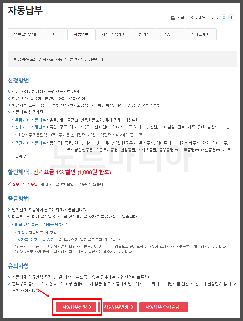 그러면 아래와 같은 화면이 나타납니다. 전기세 자동이체를 신청하시면 전기요금의 1%를 할인해줍니다. 그러나 신용카드로 신청하시면 할인이 적용되지 않습니다. 만약, 카드사에서 전기요금 자동이체시 할인혜택이 있는 것은 아닌지 확인해보시고, 특별히 할인혜택이 없다면, 통장 계좌이체 방식으로 신청하시는 것을 추천드립니다.