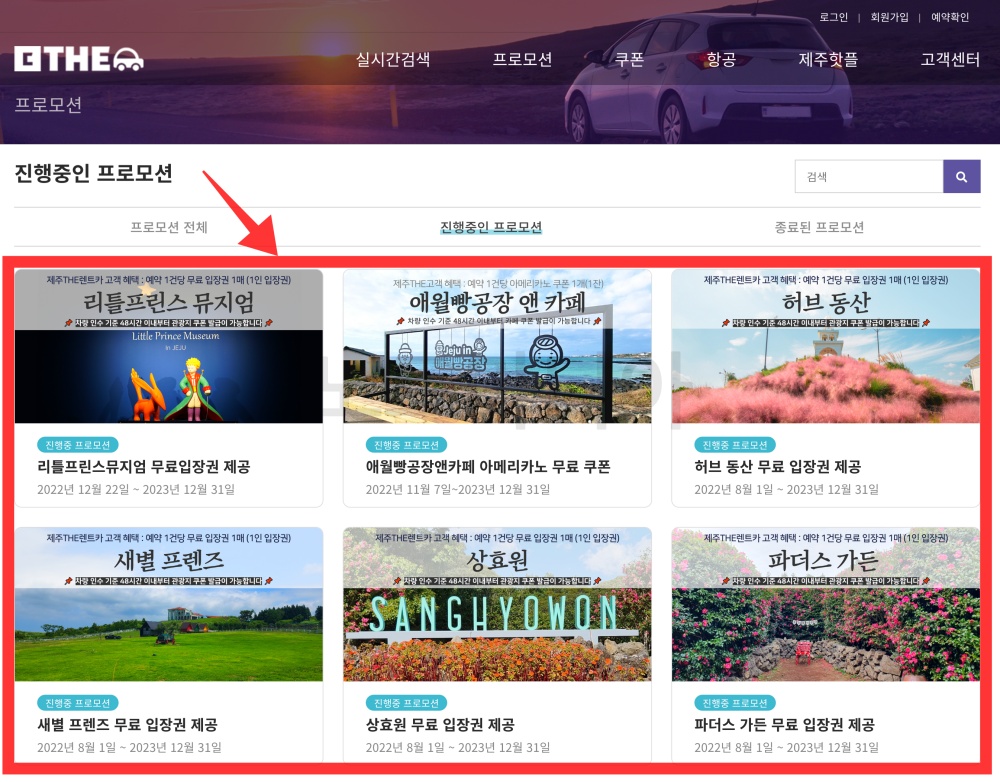 제주 THE 렌트카 가격비교 사이트는 후발 주자입니다. 하지만 장점이 있는데요. 후발주자인 만큼 진항하는 프로모션이 많습니다. 예를 들면, 제주 THE 렌트카에서 차를 빌리는 고객에게 예약 1건당 유명 관광지 무료 입장권을 제공한다는 것입니다.