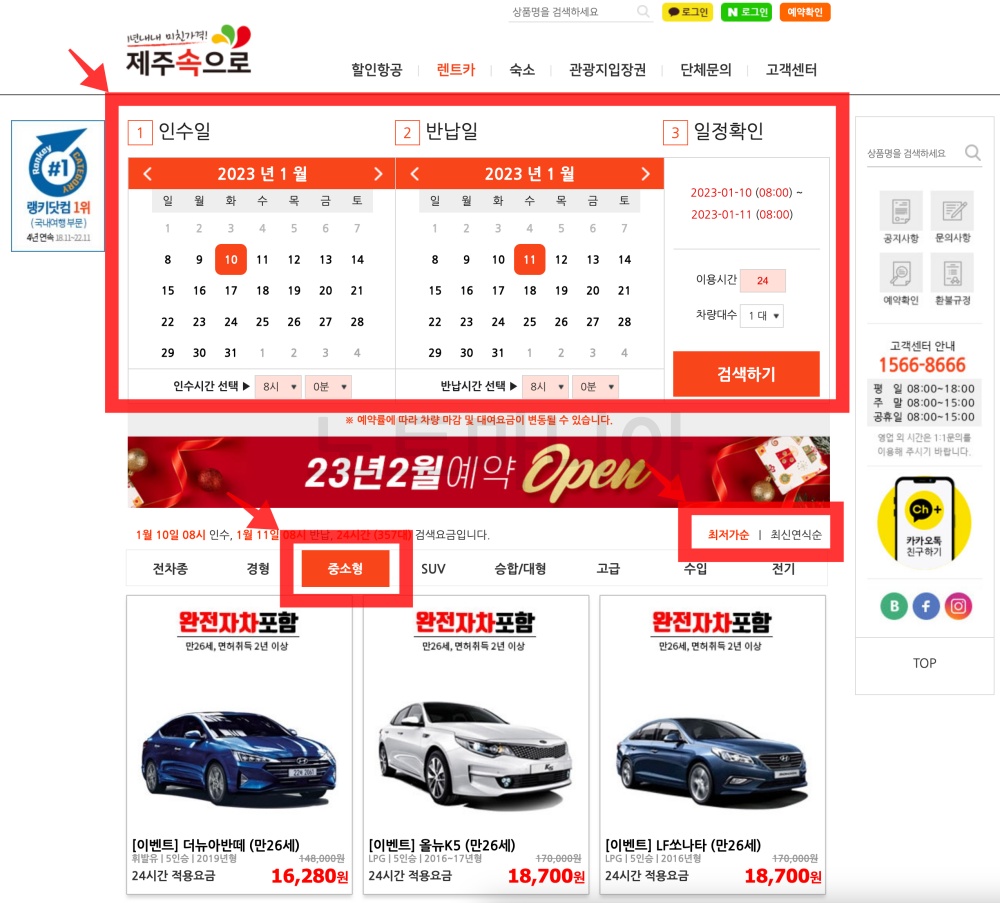 돌하루팡 홈페이지로 이동하신 다음 여행 기간을 입력하시고 '꼼수없는 1등 실시간 렌트카 가격비교 시작'을 누르시면 내가 빌릴수 있는 최저가 차량부터 원하는 옵션이나 차종도 편리하게 선택하실 수 있습니다.