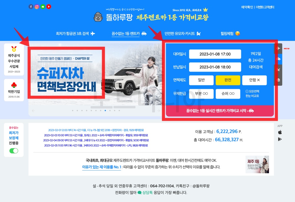 돌하루팡은 국내최초, 국내최대규모 제주도 렌트카 가격비교 사이트입니다. 이 사이트의 최대 장점은 슈퍼자차 면책보장 보험 가격이 대기업 렌트카 업체들과 비교해서 비싸면 동일한 조건으로 보상을 해준다는 것입니다.