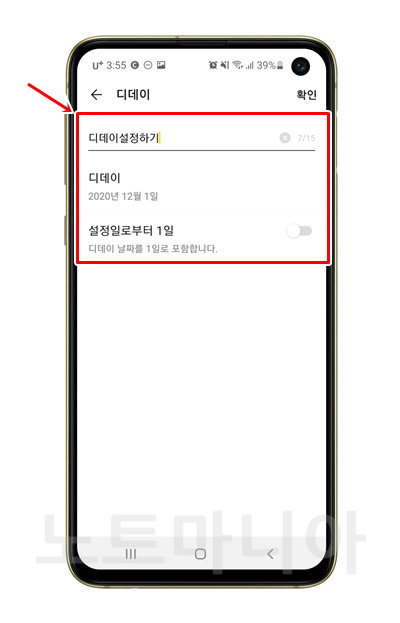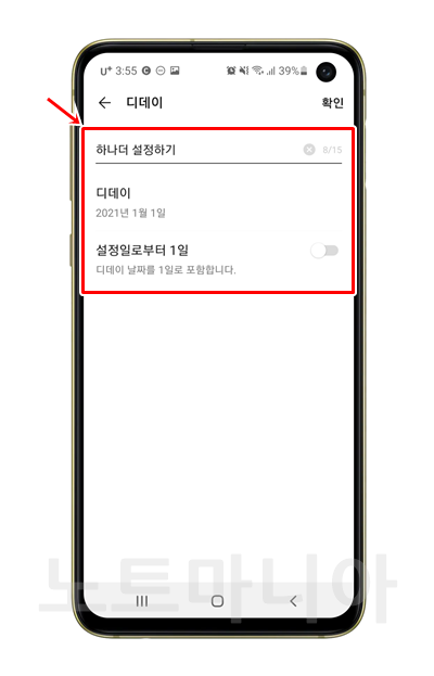아래쪽에 있는 설정일로부터 1일 옵션은 디데이를 1일로 설정하는 옵션입니다. 연인끼리 사귀기 시작한 날이나 아이가 태어난 날로 디데이로 설정할때 필요한 옵션입니다.