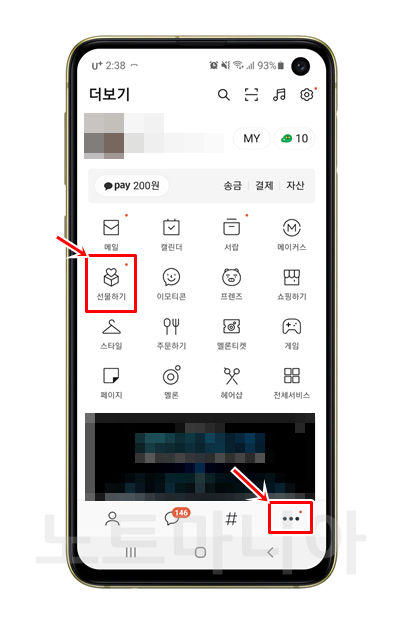 제가 받은 스타벅스 기프티콘 코드선물을 등록하는 절차를 알려드리도록 하겠습니다. 우선, 아래와같이 카카오톡을 실행해주세요. 그리고 메뉴 버튼을 눌러주세요. 점 3개가 있는 버튼입니다. 그다음 선물하기로 들어가주세요.