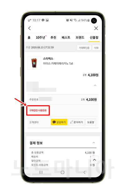 아, 상대방이 내가 선물받은 기프티콘을 사용했는지 환불받았는지 알 수 있을까요? 제가 실험삼아서 제가 예전에 기프티콘을 보냈던 친구에게 환불 신청을 한번 해보라고 했습니다. 그 결과, 아래와같이 구매 내역에서 확인해보면 '구매결정 사용완료'라고 나옵니다.