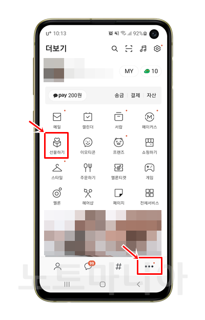 카카오톡을 실행하신 다음, 더보기 메뉴로 들어갑니다. 그다음 선물하기로 들어갑니다.