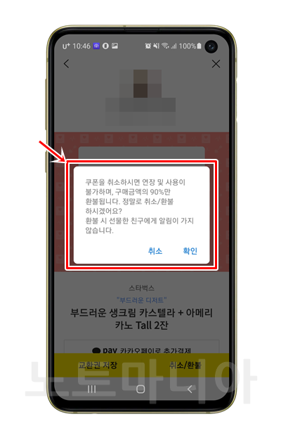 '쿠폰을 취소하시면 연장 및 사용이 불가하며, 구매금액의 90%만 환불됩니다. 정말로 취소/환불 하시겠어요? 환불 시 선물한 친구에게 알림이 가지 않습니다.'