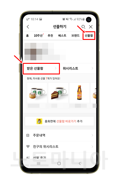 선물하기로 들어오셨으면, 선물함을 눌러주세요. 그러면 아래와같이 나옵니다. 여기에서 받은 선물함을 눌러주세요.
