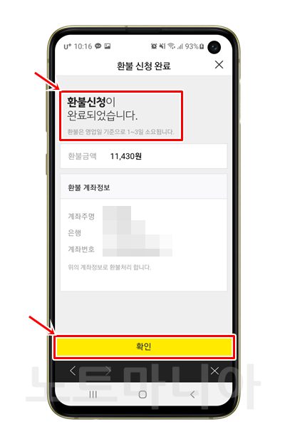 환불 계좌 정보가 이미 등록되어 있으면 이렇게 바로 환불신청이 완료됩니다. 만약, 환불 계좌가 등록되어 있지 않다면, 환불 계좌를 입력하라고 나옵니다. 간단하게 입력해주시면 바로 환불 절차가 시작됩니다.