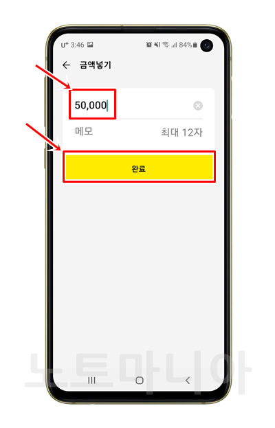 5만원을 한번 넣어봤습니다. 그리고 완료를 눌러주세요.