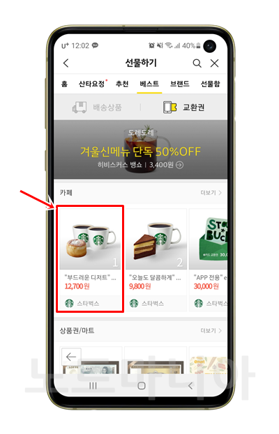 위 글을 보고 오셨나요? 선물하기 > 베스트 > 교환권 화면에서 스타벅스 세트를 선택해보았습니다. 그 다음 아래로 조금 내려오시면 이런 부분이 보입니다.