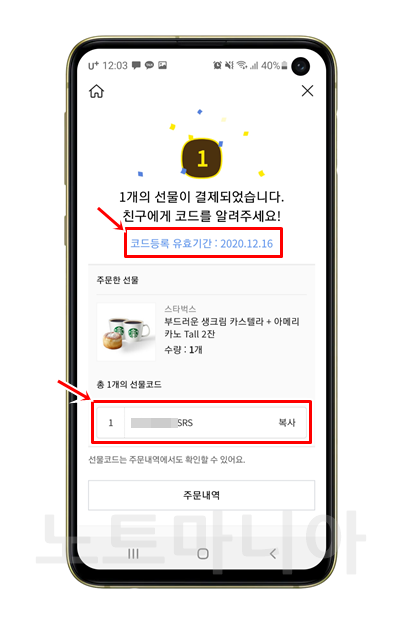그런데, 주의할 사항이 있습니다. 카톡코드 선물하기를 하실때, 결재를 하시면 코드등록 유효기간이 나옵니다. 코드등록 유효기간은 일주일입니다.