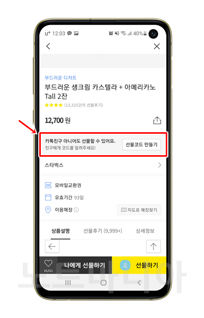그러면 이렇게 '선물하기'가 '선물코드 만들기'로 바뀝니다. 해당 버튼을 눌러서 결제를 진행해주세요.