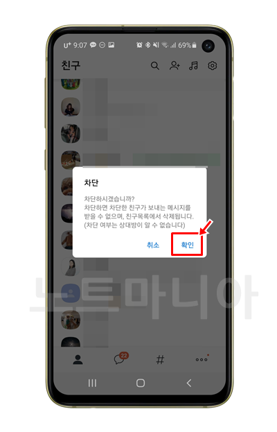 "차단하시겠습니까? 차단하면 차단한 친구가 보내는 메시지를 받을 수 없으며, 친구목록에서 삭제됩니다. (차단 여부는 상대방이 알 수 없습니다)" -> 확인