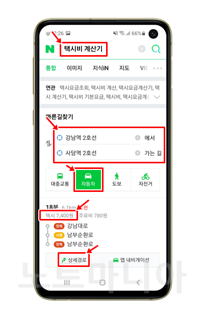 모바일에서도 동일하게 네이버 택시비 계산기를 이용해서 미리 택시요금 조회를 해볼 수 있다. 아래와같이 네이버에서 택시비 계산기를 검색한 다음, 빠른길찾기 메뉴에서 출발지와 도착지를 입력하고 자동차를 선택하고 조회하기를 누르면 예상 택시요금이 조회된다.